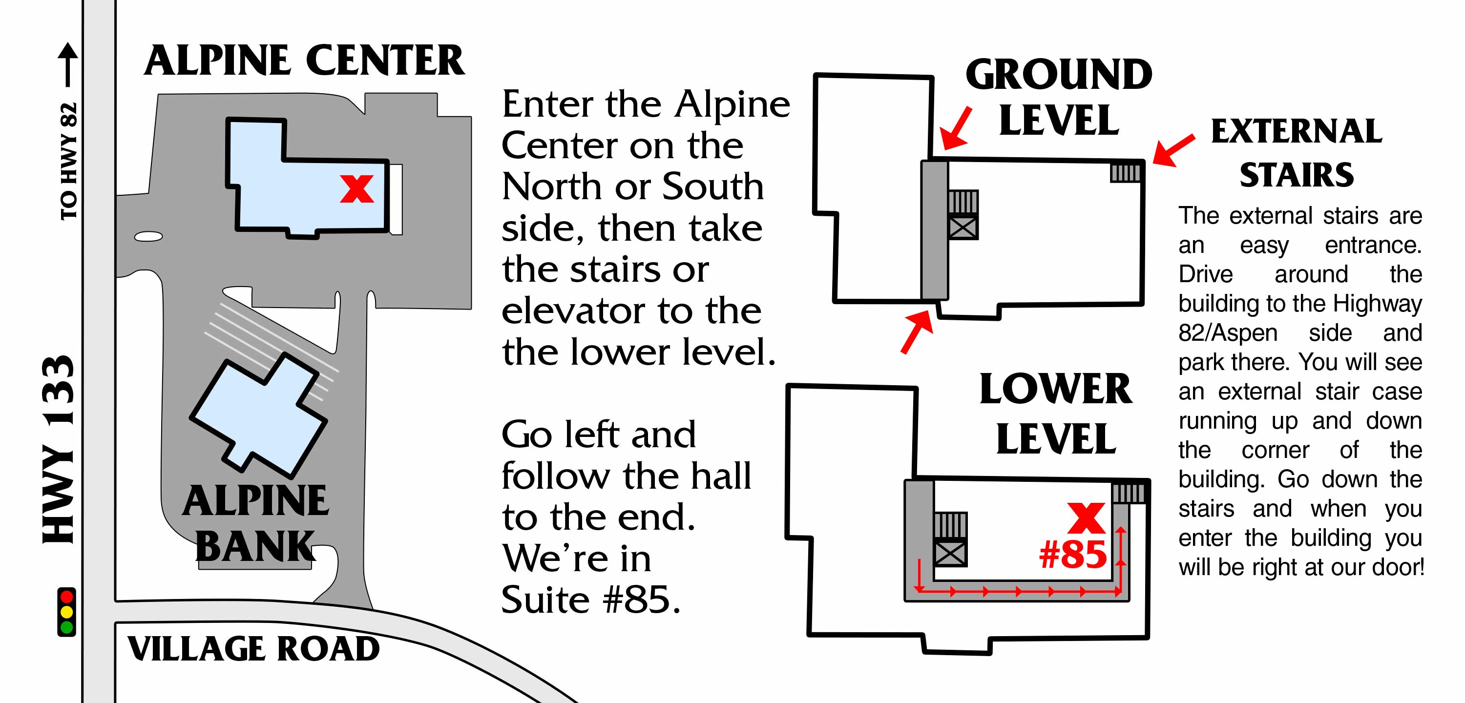 Take Highway 82 South towards Aspen. Approximately 12 miles out of Glenwood take a right and cross over the bridge into Carbondale. Before the first stop light turn left into the Alpine Center just before Alpine Bank. Drive around to the back side (Aspen/Hwy-82) of the building and go down the external stairs. You’ll enter the building right at my door.